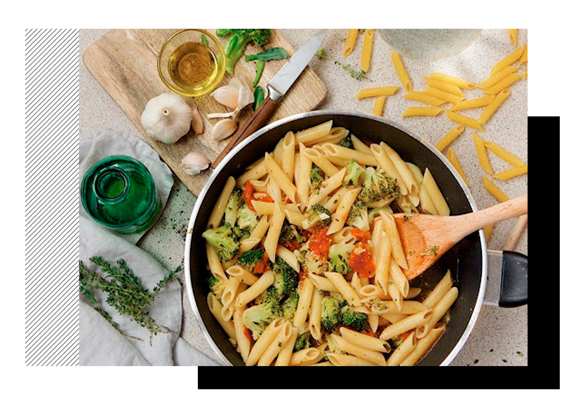 Спосіб приготування. Відварити макарони. Окремо відварити брокколі до напівготовності. У сковороді розігріти масло і обсмажити на ньому до м'якості дрібно нарізану цибулю і часник. Потім в сковороду відправити нарізані скибочками гриби та соломкою перець, готувати на середньому вогні 3-5 хв. Додати в скоровороду нарізані на кубики помідори і суцвіття брокколі. На невеликому вогні потримати все близько 3 хв, додати пасту і перемішати.