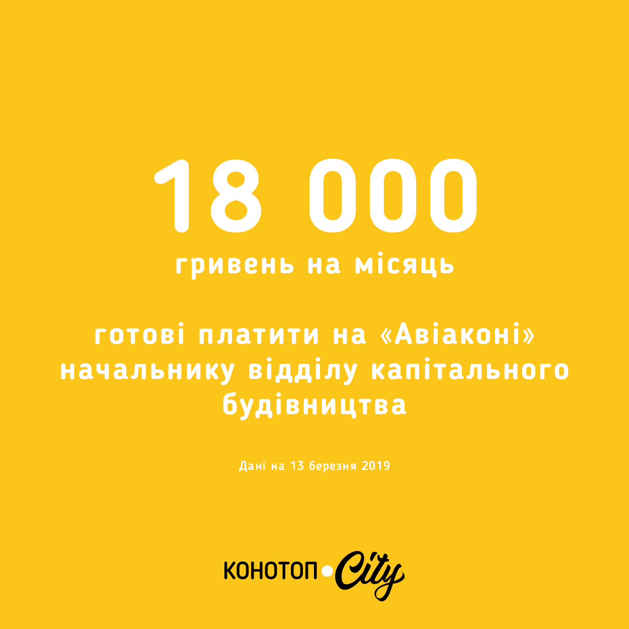 Серед варіантів — посада начальника відділу капітального будівництва на державному підприємстві «Конотопський авіаремонтний завод «Авіакон». Пропонують 18 тисяч гривень на місяць.