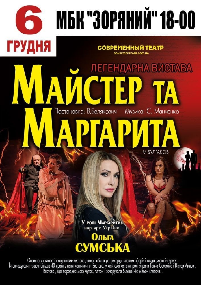 Вистава «Майстер і Маргарита» відбудеться 6 грудня 2019 о 18:00 в МБК «Зоряний». У ролі Маргарити — Народна артистка України Ольга Сумська.