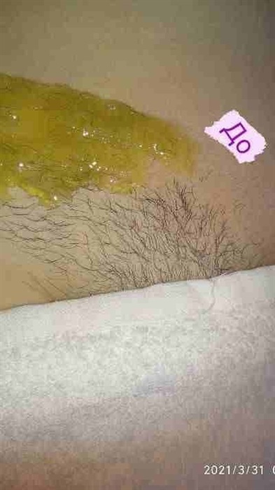 Потім проти росту волосся акуратно накладаю пасту для шугарингу, і одним різким рухом (вже по росту волосся) зриваю застиглу смугу карамелі разом з прилиплими волосками.